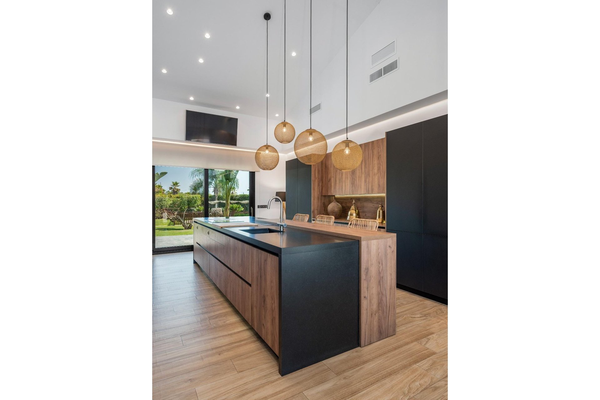 REF: GV-108. Ginta Veisa inmobiliaria les presenta este espectacular chalet en Elche, zona las Bayas.~~Un hogar independiente y divino, en toda regla. Espectacular villa de lujo de reciente construcción, finalizada la obra en noviembre del 2022. Cuenta con unas extraordinarias calidades, un atractivo diseño y precioso jardín con piscina.~~Consta de 320 m² construidos en una única planta, se distribuye en un amplio salón-comedor de 45 m² con una chimenea insertada, conectada con una cocina de diseño de 40 m² con isla central con barra americana y, además, con vinoteca para 80 botellas. Además cuenta con un cuarto para zona de planchado.~~Se compone de cinco amplios dormitorios. Pero el principal destaca sobremanera con sus 67 m², con vestidor, una gran ducha doble y con acceso directo al jardín y piscina. Además cuenta con gimnasio, despacho, dos baños adicionales con bañera de hidromasaje, todos con duchas electrónicas de efecto lluvia, control de temperatura, e hilo musical.~~El exterior es igual de impresionante. Cuenta con una piscina con cascada natural de agua, que está rodeada de un espectacular jardín de 6000 m² de palmeras y olivos.~~Como otras características a destacar; cuenta con suelo radiante en toda la vivienda o Air-Zone para poder poner cada estancia a una temperatura deseada, incluso desde el móvil. El garaje puede albergar varios vehículos. Cuenta también con alarma, persianas eléctricas motorizadas, certificado energético tipo A.~~A solo 5 minutos de las playas de Santa Pola, y 15 minutos del aeropuerto y de la ciudad de Elche; esta puede ser la casa que cuenta con todo lo que necesitas para tu familia.~~¡¡LLÁMENOS PARA VISITARLA, LE GUSTARÁ!!~~***Este anuncio puede contener errores. La información se muestra a título informativo, no comprometiendo contractualmente a Ginta Veisa Servicios Inmobiliarios. Tanto los datos, como las imágenes y planos pueden estar sujetos a cambios, por lo que le invitamos a que, si precisa una información más exacta y detallada, comprobar datos, así como situación jurídica de los inmuebles, contacte con nosotros y le atenderemos a la mayor brevedad posible.~~Notaria, Registro e Impuestos no incluidos en el precio publicado.~